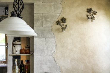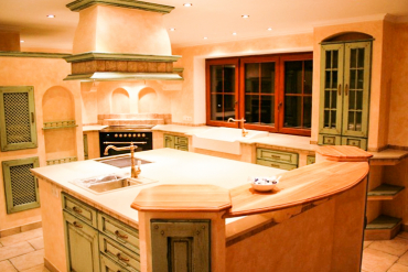Das spannende Gestaltungskonzept der Landhausküche „Avignon“ wird durch die Verwendung des robusten Materials der Fronten bestimmt, die sehr gut mit den gemauerten toskanischen Küchenmöbeln harmonieren.
