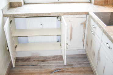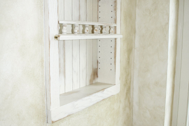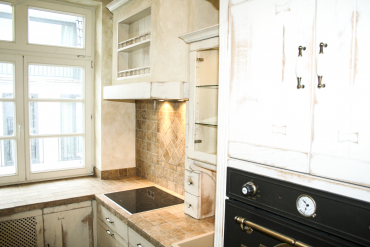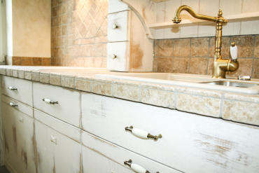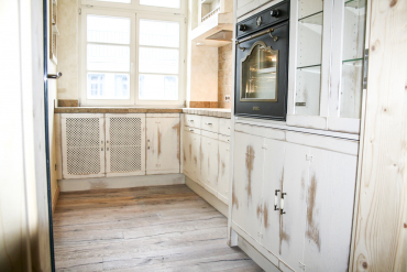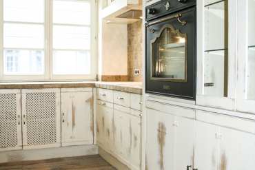 Die Fronten dieser edlen Landhausküche sind aus Eiche. Das Reizvolle dieser italienischen Kücheneinrichtung ist die abgeschliffene Front, sodass sie trotz weißer, glatter Oberfläche eine warme und gemütliche Erscheinung haben. Dazu schleifen wir die Farbe so weit ab, bis die rustikale Schönheit des Eichenholzes zum Vorschein kommt.