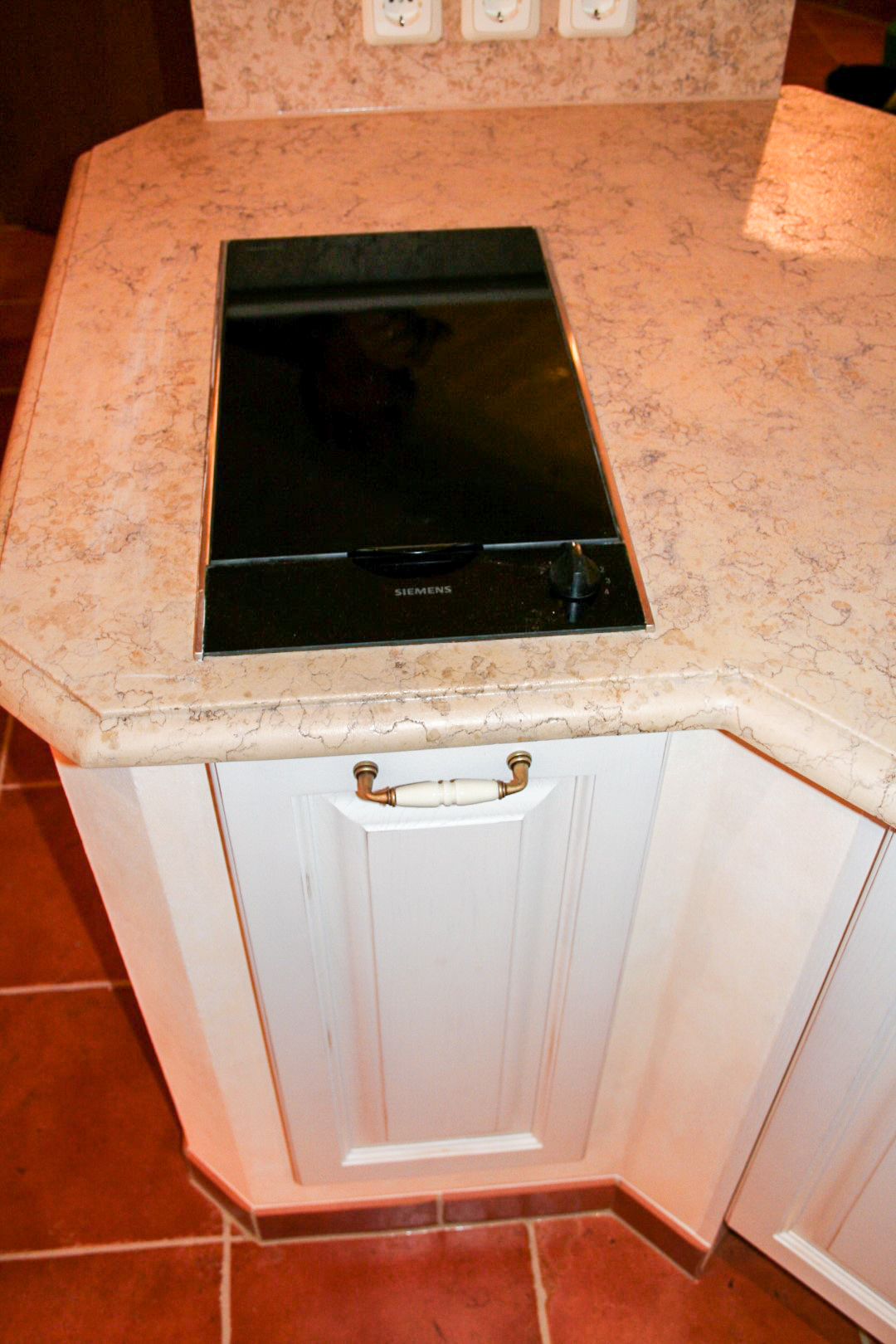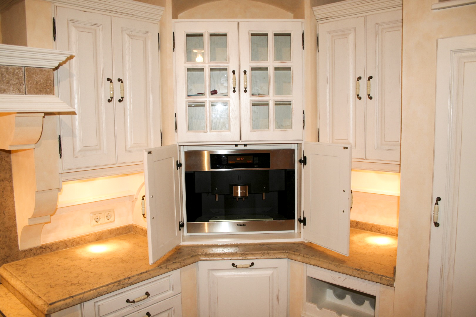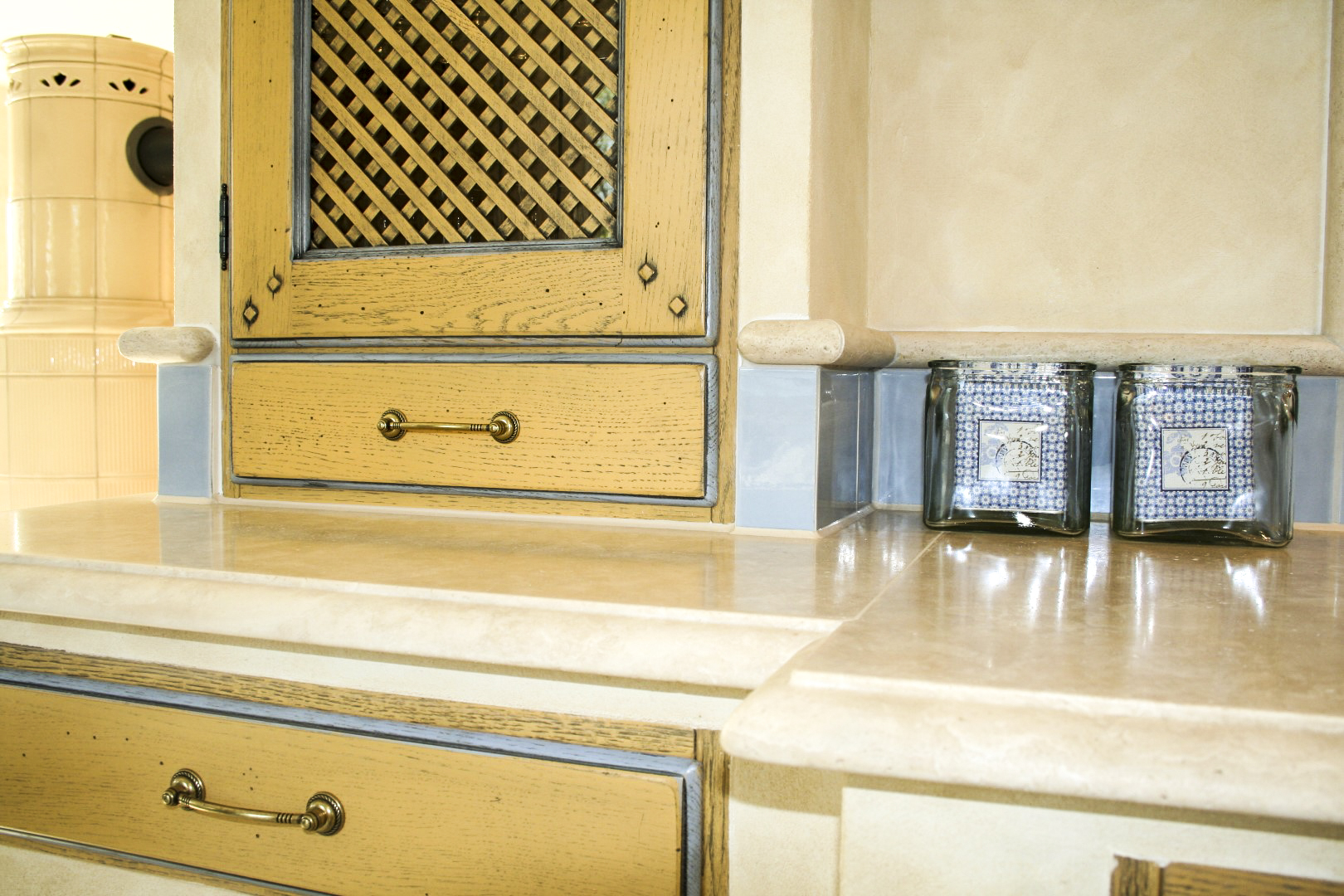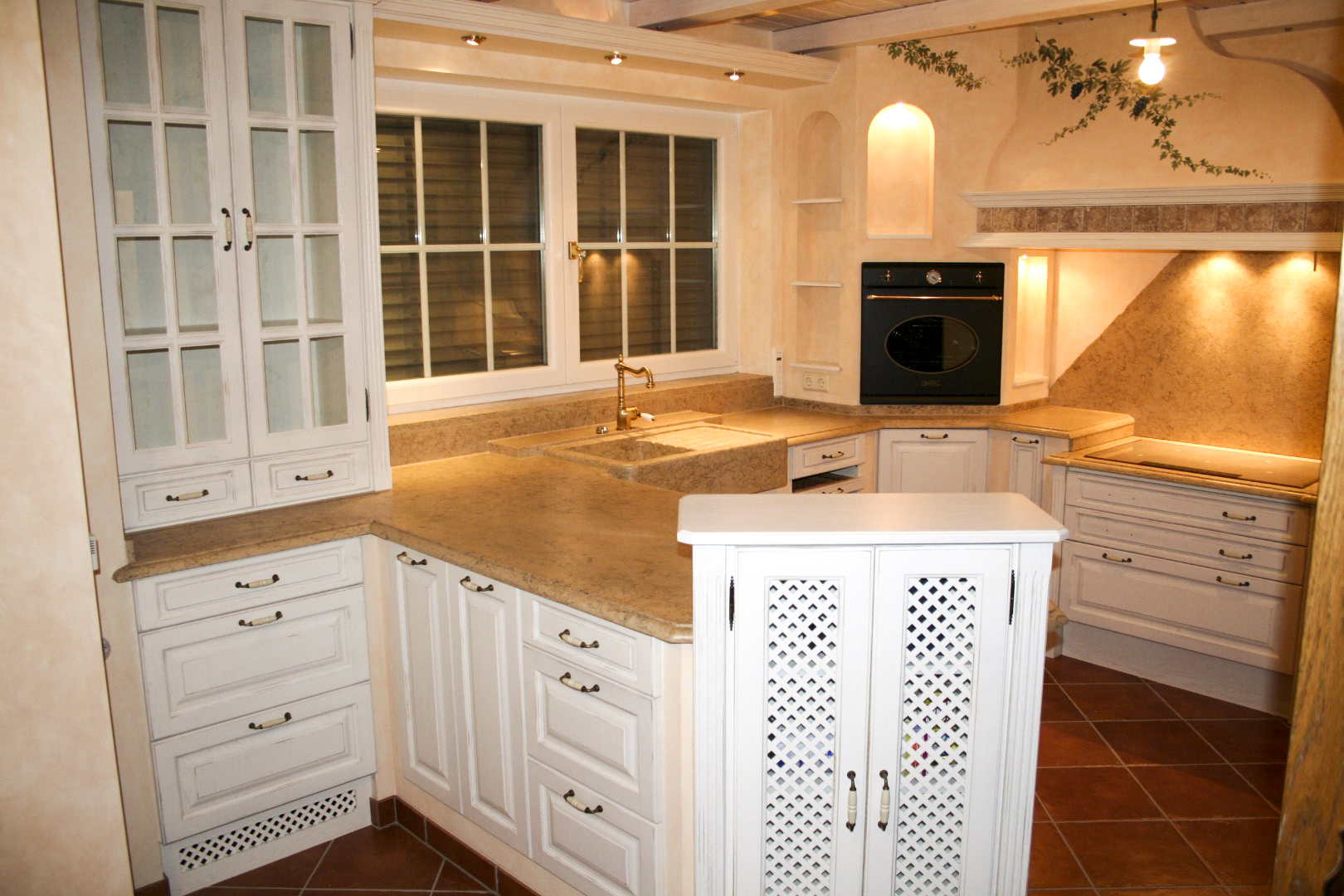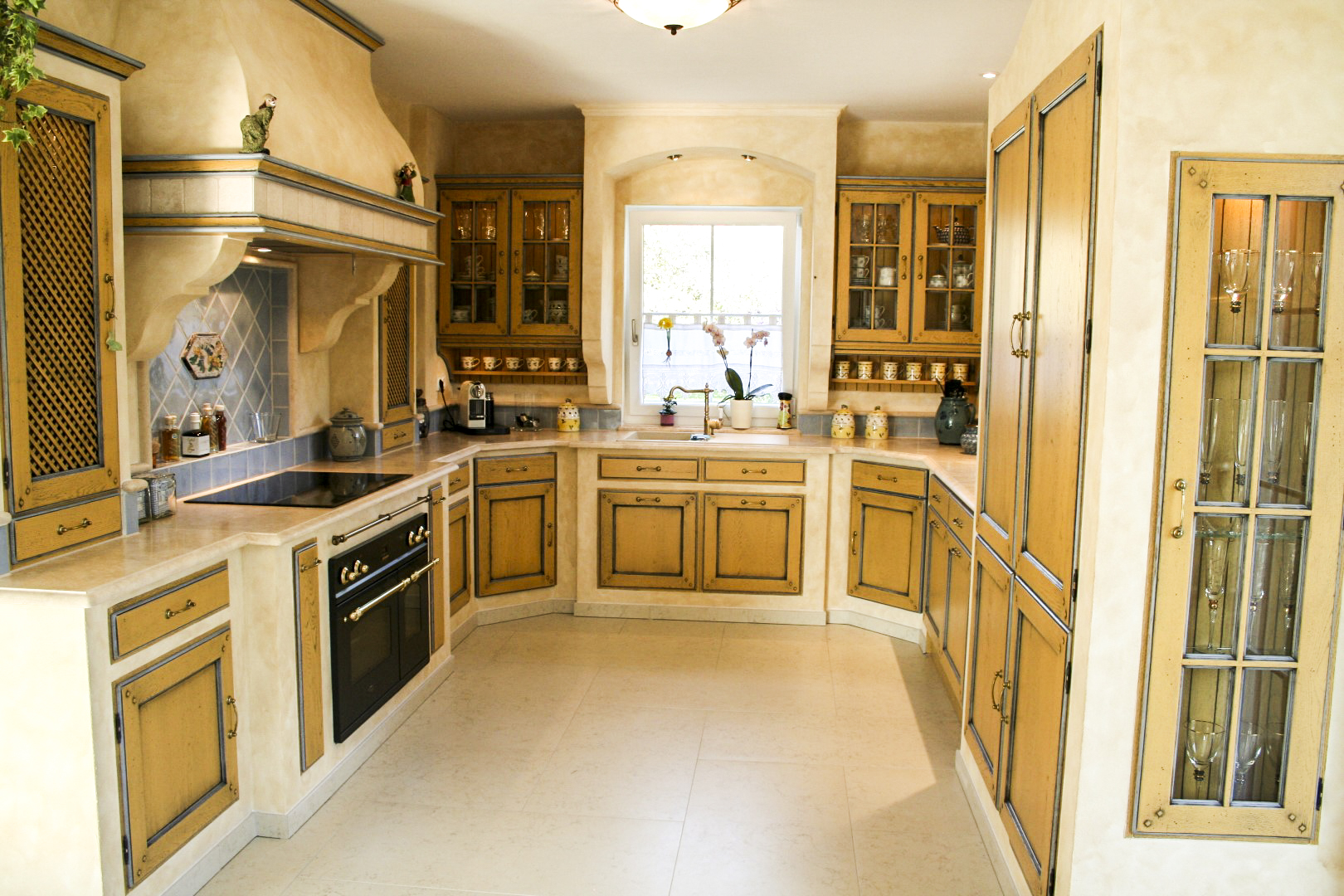 Alle Villa Medici Küchen werden aus Hartholz gefertigt (hauptsächlich Eiche), mit hochwertigen Acryllacken lackiert und per Hand patiniert. Um möglichst jederzeit in der Lage zu sein, einzelne Elemente der Küche, auch später, wieder herzustellen verwenden wir immer Herstellergemischte Farben und Antiklacke (Patina). Die Gebrauchsspuren sowie modellinterne Änderungen können bei jeder Küche ohne Mehrkosten verändert bzw. abgestimmt werden. Volltonlackierte Oberflächen können alternativ auch in MDF oder anderen Hartholzarten erstellt werden.
